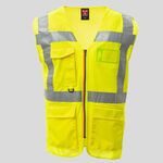 Gilet in alta visibilità realizzato in rete traspirante nella parte superiore e in tessuto dry-tech nella parte inferiore, con bande retroriflettenti orizzontali su spalla, petto e vita e due bande retroriflettenti verticali. Chiusura con zip SBS, con nastro bicolore. Porta badge fisso su petto sinistro a capo indossato. Passante multifunzione, una tasca con porta penne chiusa con velcro e anella su petto destro a capo indossato. Due tasche esterne a soffietto chiuse con velcro nella parte alta ed apertura laterale.