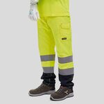 Pantalone da lavoro estivo alta visibilità EN 20471 CL 2  55% cotone 45% poliestere 190gr con bande retroriflettenti, con passanti ed elastico in vita. Chiusura con zip e bottone in plastica. Tasche anteriori con taglio sagomato; una tasca laterale con patta di chiusura LOCK SYSTEM su gamba sinistra; una tasca porta metro a destra. Due tasche posteriori, di cui una con patta e strappo. Cuciture a contrasto. Cavallo e interno gamba a triplo ago.