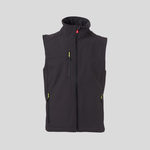 WP 8000 mm H₂O, WVT 5000 g/m² 24h. Gilet soft-shell 3 strati, leggero, da uomo, chiusura tramite zip SBS con cursore in metallo "semi-auto lock" e tiretto personalizzato. Banda retroriflettente su fondoschiena. Due tasche laterali con zip, una tasca al petto con zip spalmata. Tiretti fluorescenti. Una tasca a filetto interna, con chiusura a strappo. Fondo regolabile con stopper personalizzati.