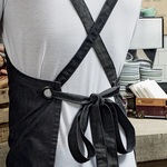 100% cotone. Grembiule, con cinturini in tessuto, tasca anteriore centrale con slot per penna incorporato, chiusura con fibbia in stile dungaree, occhielli metallici. 320 g/m2